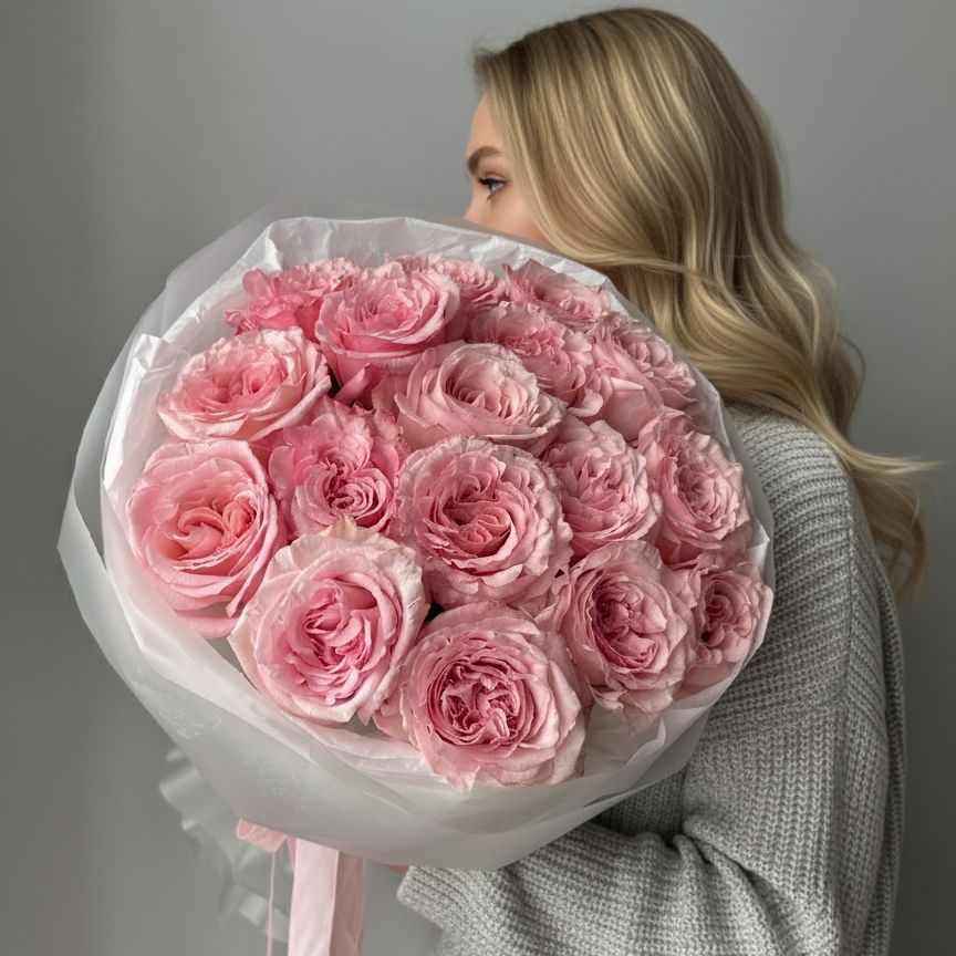Этот букет - это пышное, ароматное облако нежности. Семнадцать великолепных роз сорта 'Пинк Охара' собраны вместе, чтобы покорить своей красотой и пьянящим запахом. Их нежно-розовые лепестки раскрываются в пышные, почти зефирные бутоны, создавая ощущение роскоши и романтики. Я выбрала легкую белую упаковку, чтобы подчеркнуть их воздушность.