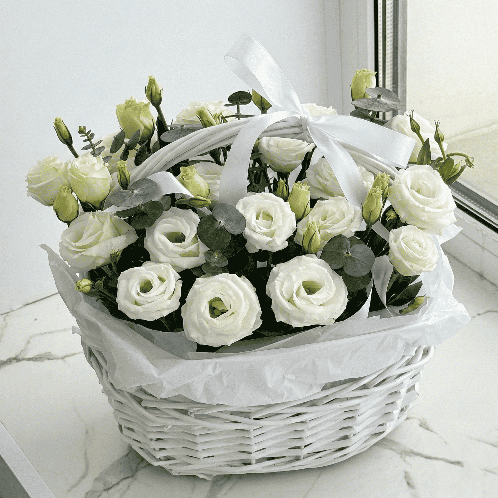 Изысканная композиция, излучающая абсолютную чистоту и гармонию. 9 пышных веток белоснежной эустомы, усыпанных нежными бутонами-розочками, словно парят на фоне благородной серебристой зелени эвкалипта. Элегантная белая плетеная корзина с атласным бантом придает подарку статусность и особый, классический шарм. Благодаря питательной флористической губке цветы не требуют вазы и будут очень долго радовать получателя своей первозданной свежестью.