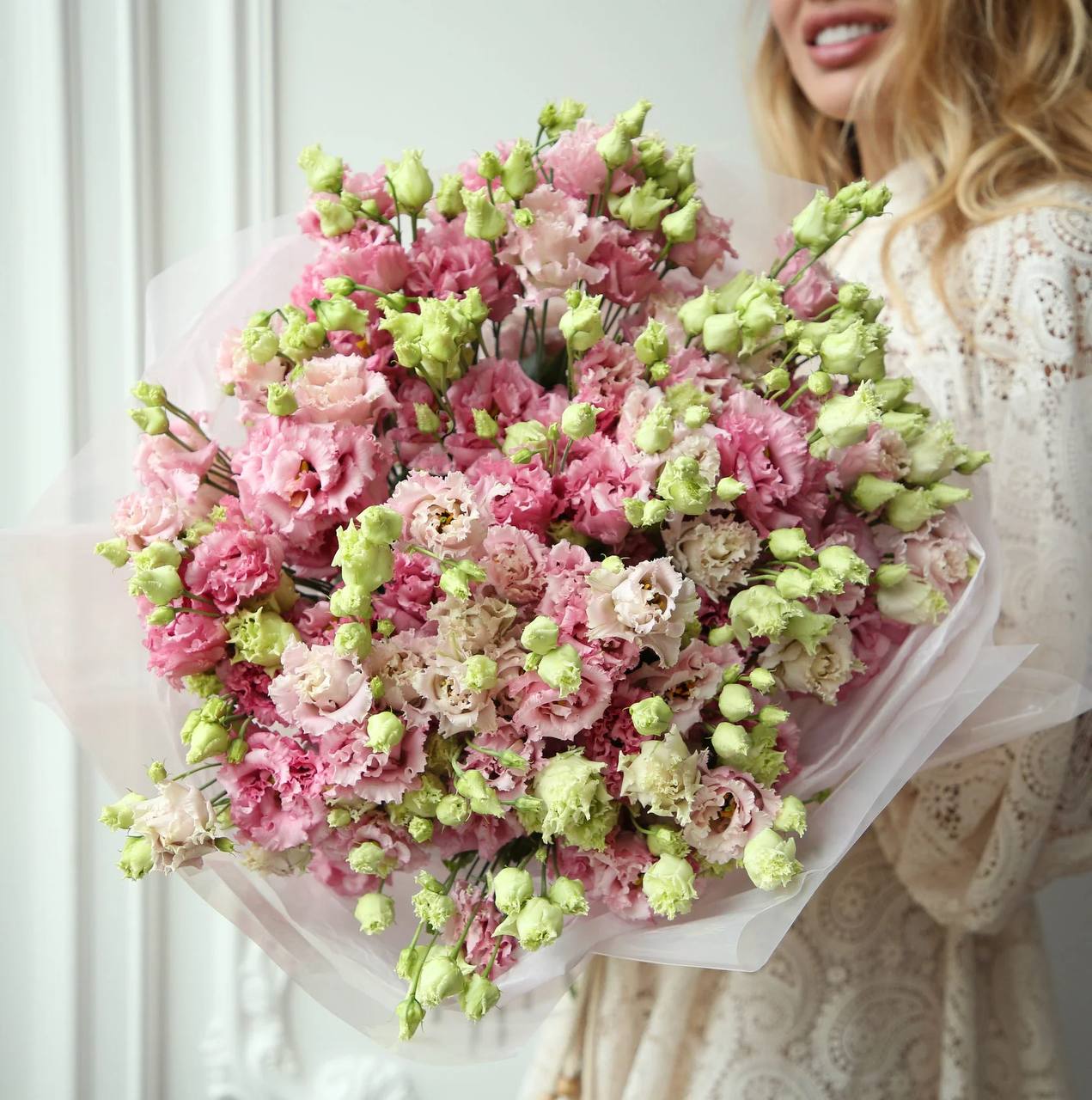 Воздушная композиция из 25 веток отборной эустомы создает невероятный объем и ощущение легкости. Нежные кружевные лепестки в розовых тонах идеально сочетаются со светлой матовой упаковкой, подчеркивающей природную красоту цветов. Этот букет станет идеальным подарком для романтического свидания или важного торжества.