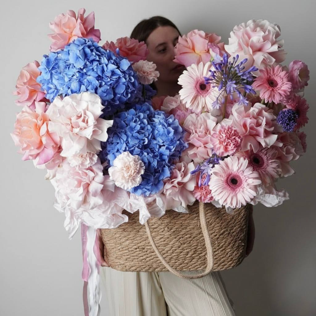Această compoziție este o sfidare a gravitației și a standardelor, un adevărat eveniment floral care nu poate fi uitat. Am adunat în această geantă imensă de iută o seră întreagă: hortensii de un albastru-ceresc, zeci de trandafiri francezi și gerbere delicate, dianthus dantelat și săgețile exotice ale agapanthusului. Comandați flori online Chisinau pentru un gest memorabil.