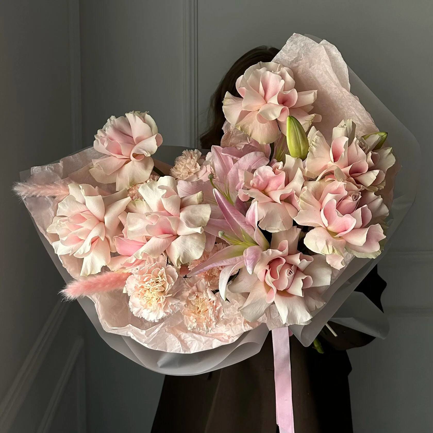 Создавая этот букет, я хотела подчеркнуть чистую элегантность и роскошь. В центре композиции — невероятные французские розы, чьи лепестки раскрываются подобно пышным бальным платьям. Их нежный розовый цвет идеально гармонирует с грациозными, ароматными лилиями, которые добавляют букету ноту аристократизма.