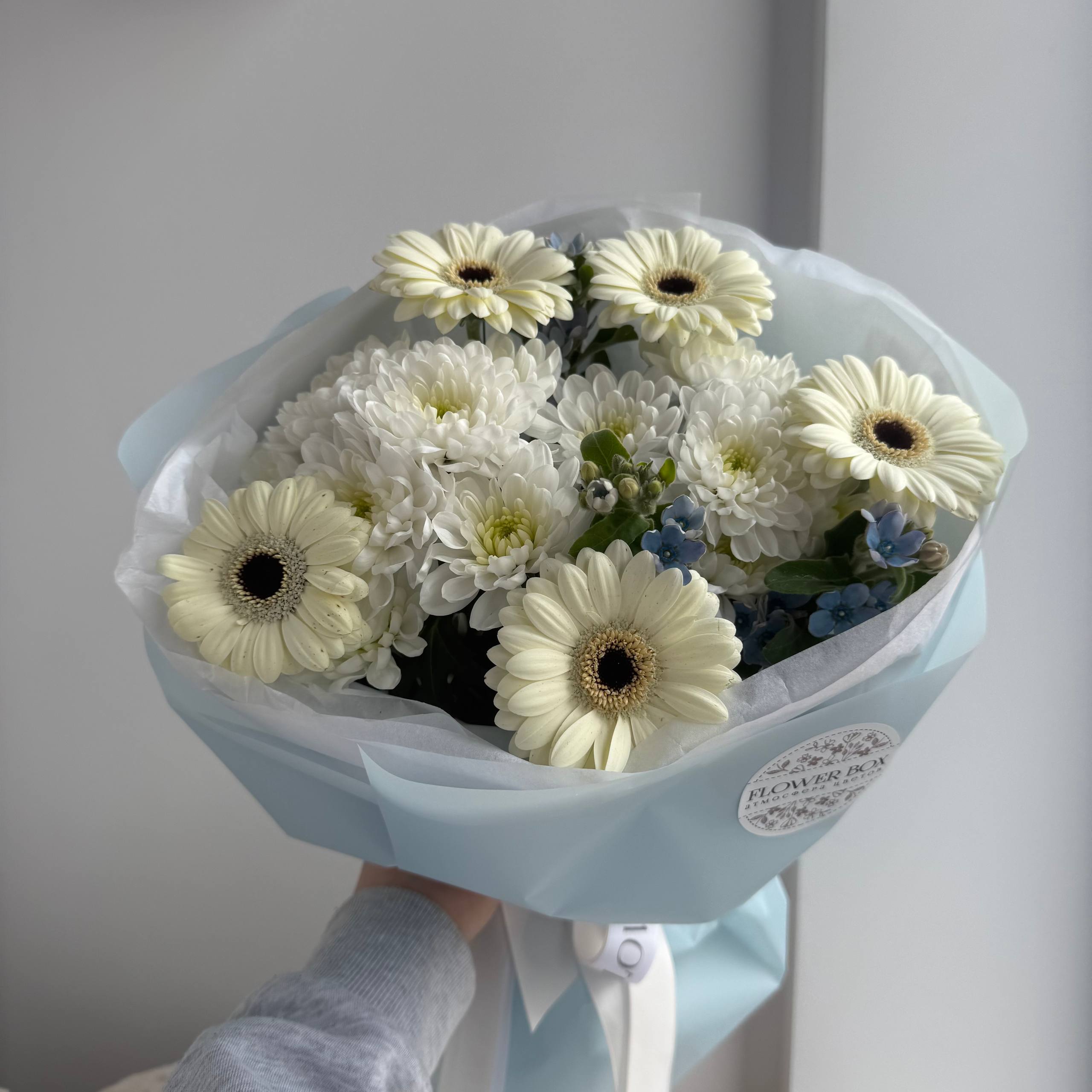 Авторский микс «Белые герберы и хризантемы: Blue Cloud»